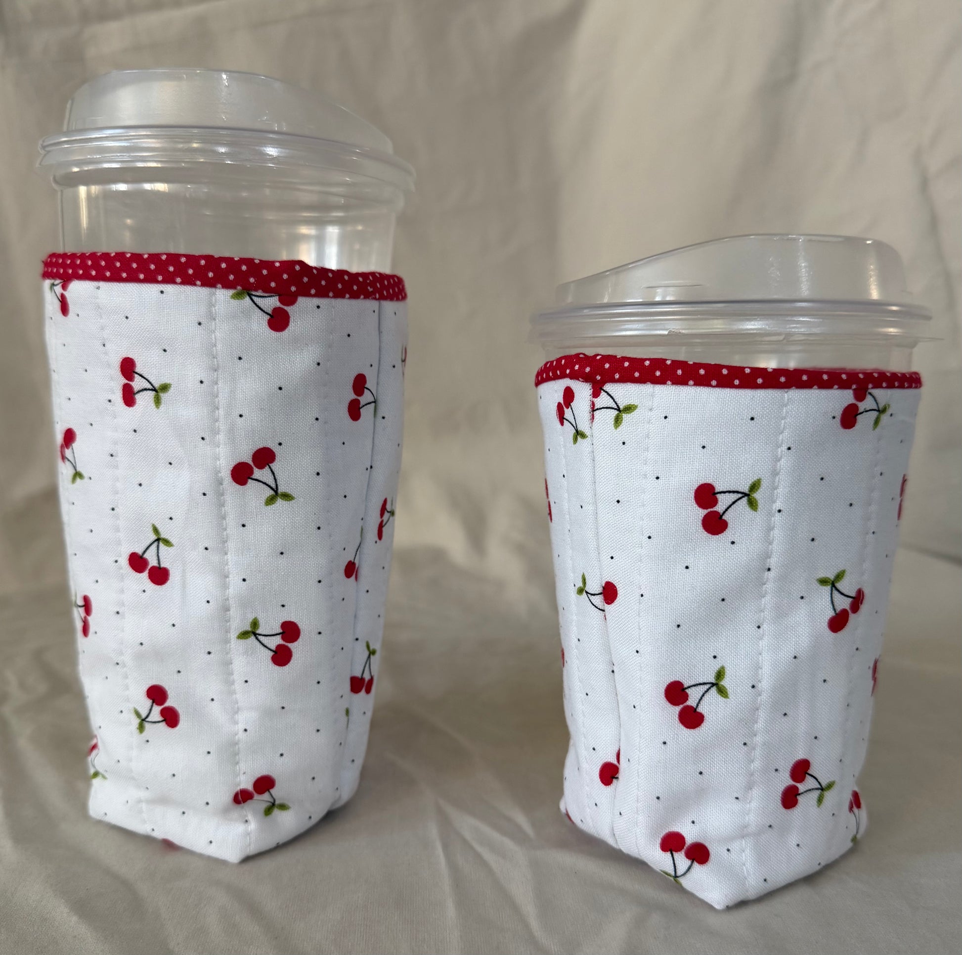 These insulated drink cozies are perfect for busy morning coffee runs to keep your drink at the perfect temperature! There are two available sizes to accommodate most travel size cups. Each cozie is 100% handmade with a cotton outer fabric, cotton inner lining, and a polyester blend insulated layer inside. These cozies are pictured with medium and large size to go cups from Starbucks for size reference. These cozies feature the cherry print on the outside and a red polka dot print on the inside!