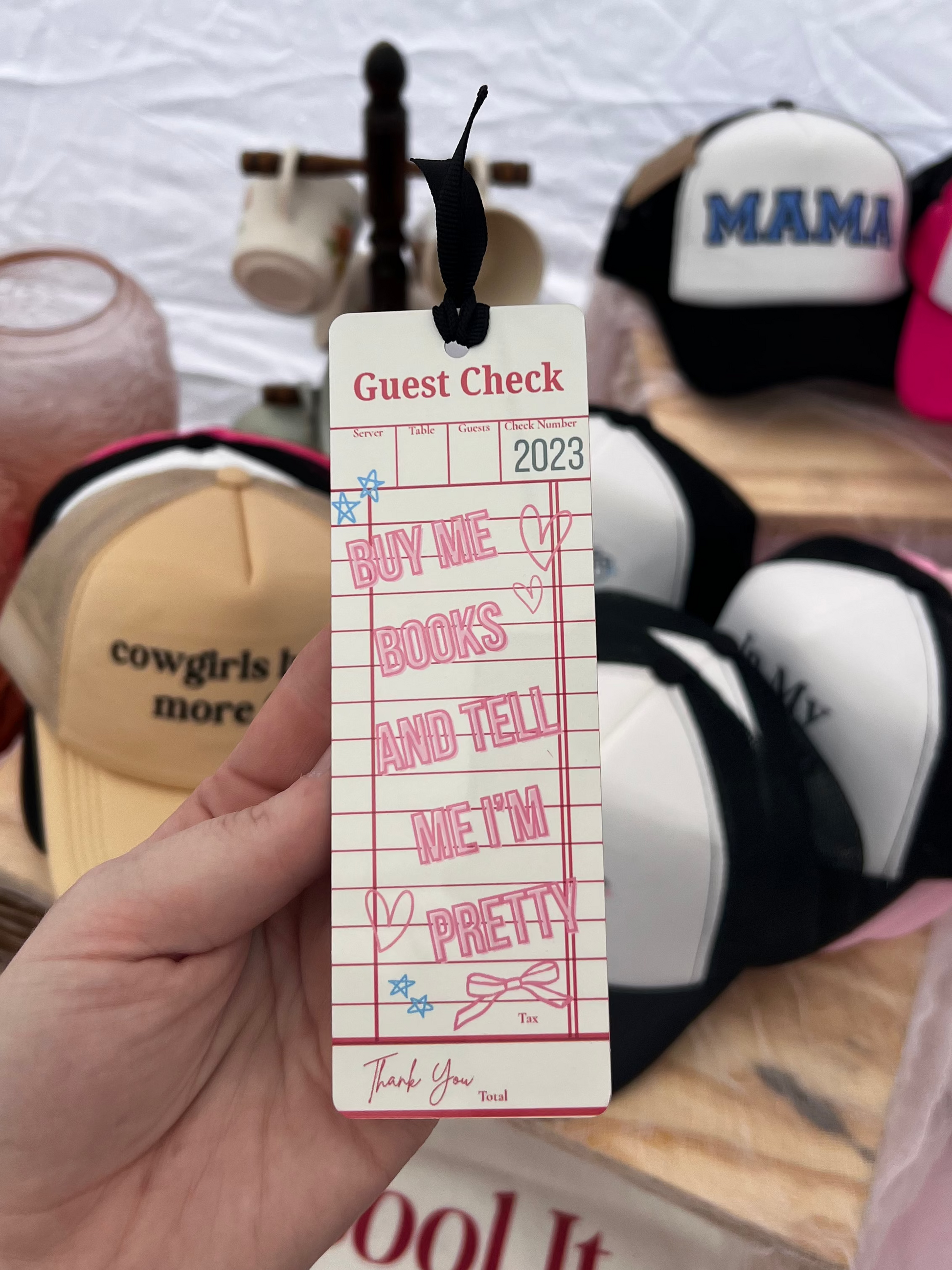 This bookmark is the perfect addition to your daily reader! It is a metal bookmark with images on both sides and has a cute black ribbon hanging from the top. This bookmark has the phrase "Buy Me Books And Tell Me I'm Pretty" in pink, on a guest check background, and matching multicolor doodles that have been heat pressed to the bookmark, making it a long-lasting print. Unlike vinyl the images will not crack or peel over time so you can use it again and again with every new book!
